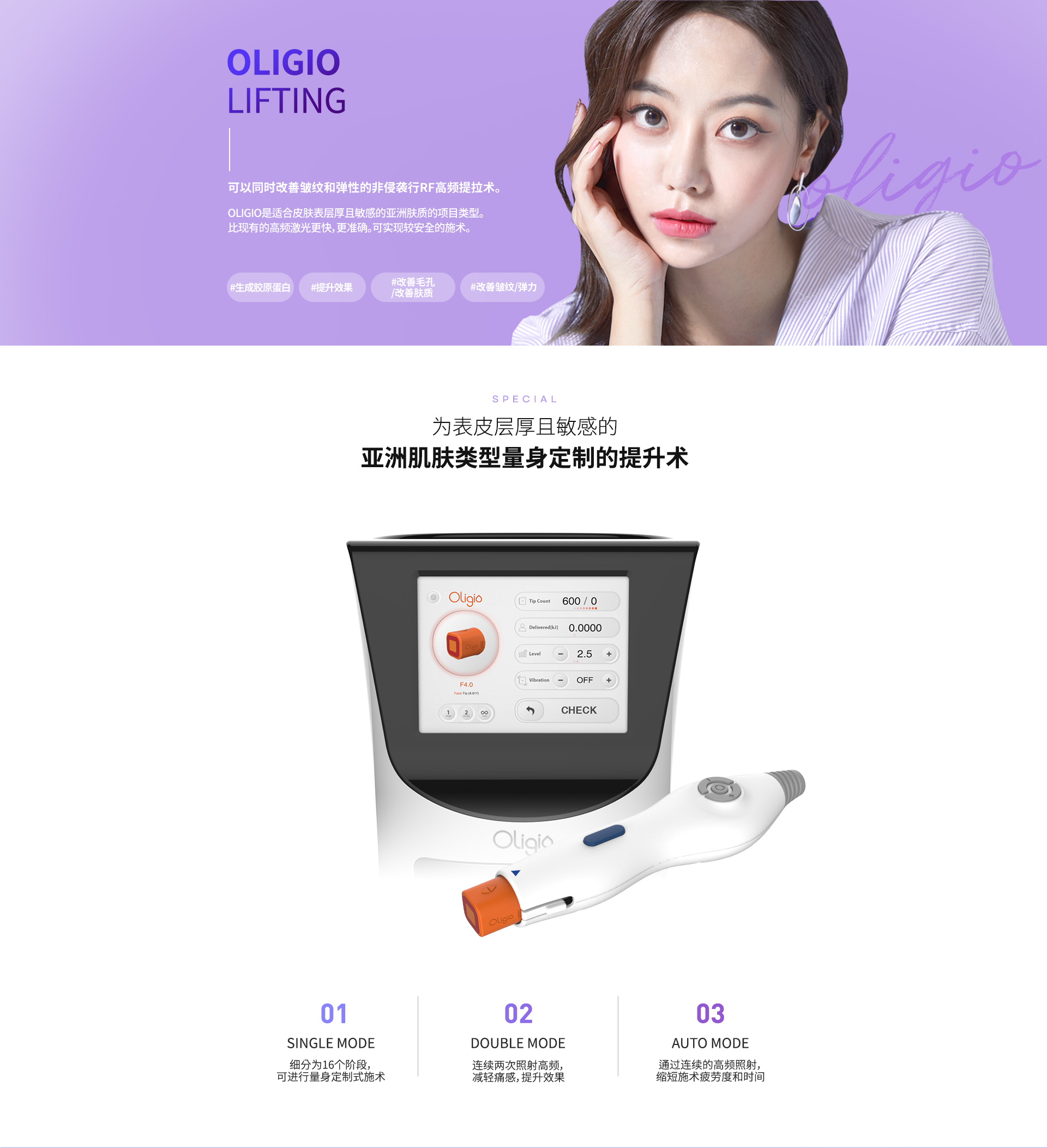 韩版热玛吉(Oligio)是一种利用射频能量刺激真皮层胶原蛋白生成,帮助增加皮肤弹力,改善皱纹的项目。